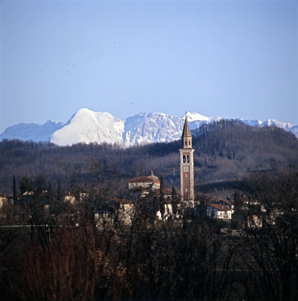 La chiesa di San Giorgio a Lucinico con alle spalle il Monte Calvario e sullo sfondo il Monte Nero |
