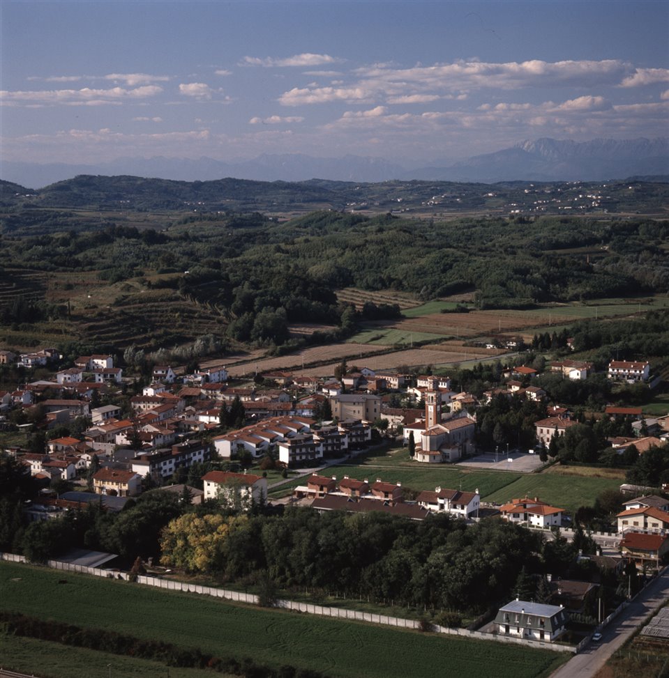 Veduta aerea dell’abitato di Mossa con la chiesa di Sant’Andrea Apostolo; sullo sfondo il Collio |