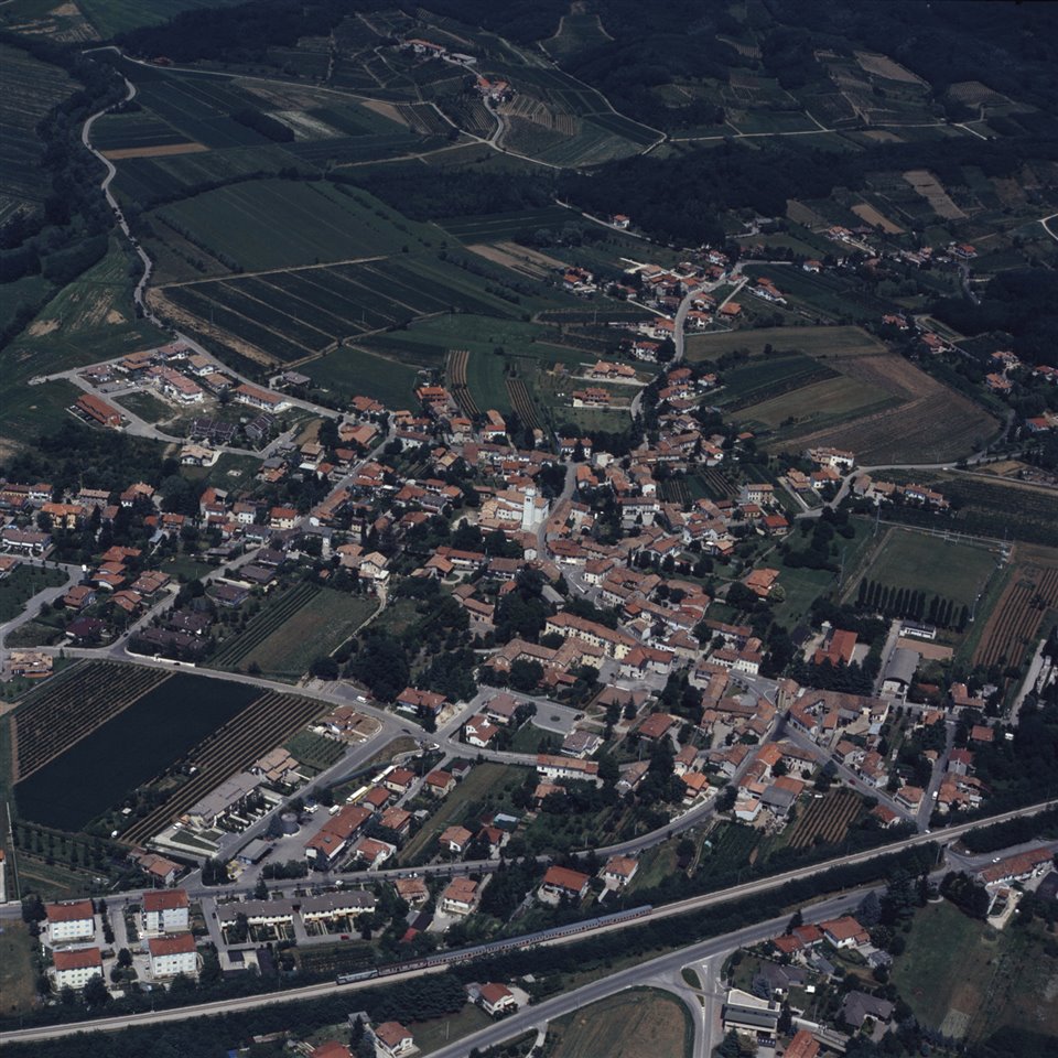 Veduta aerea dell’abitato di Capriva del Friuli con la linea ferroviaria Udine-Trieste |