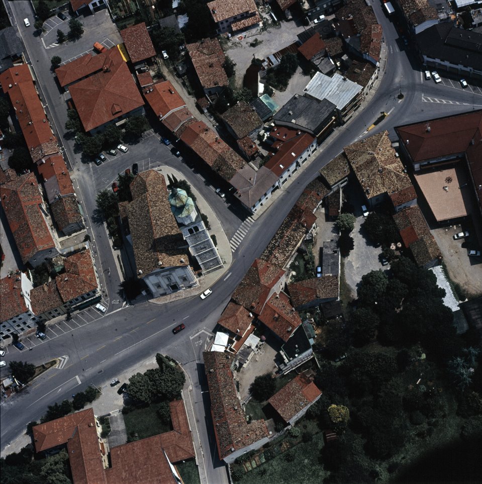 Veduta aerea dell’abitato di Romans d'Isonzo con la chiesa di Santa Maria Annunziata, via la Centa e la strada regionale 252 |