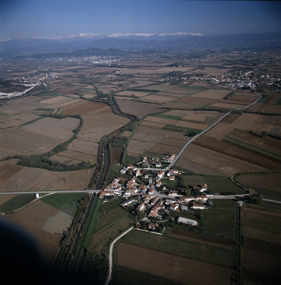 Veduta aerea della frazione di Fratta nel comune di Romans d’Isonzo; sullo sfondo il Monte Quarin e le Prealpi Giulie |