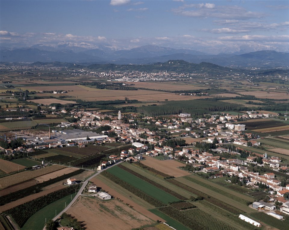 Veduta aerea dell’abitato di Mariano del Friuli con la chiesa di San Gottardo e lo stabilimento Italsvenska; sullo sfondo il Monte Quarin e le Prealpi Giulie |