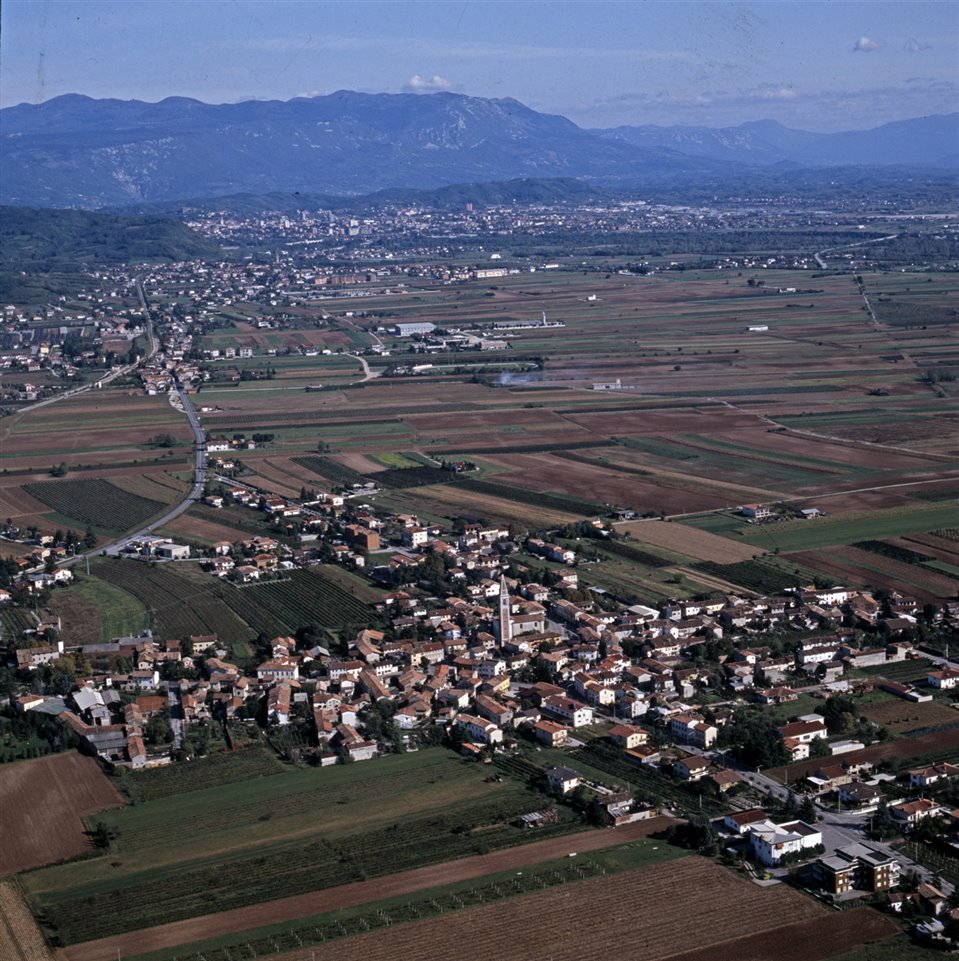 Veduta aerea dell’abitato di San Lorenzo Isontino con la chiesa di San Lorenzo Martire; sullo sfondo la città di Gorizia e l’altopiano di Tarnova |
