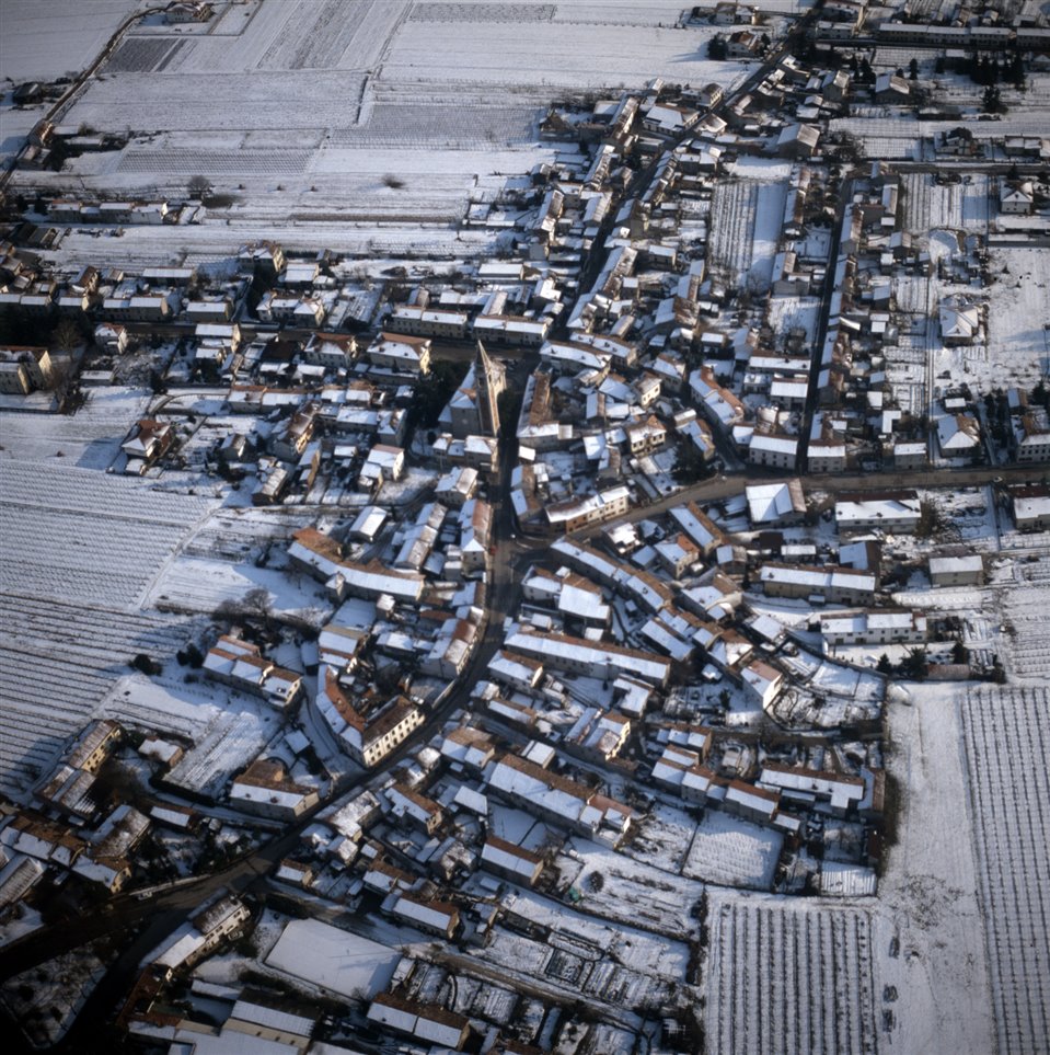 Veduta aerea dell’abitato di San Lorenzo Isontino con la chiesa di San Lorenzo Martire |