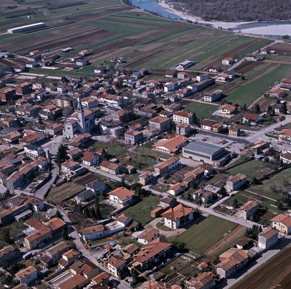Veduta aerea della frazione di Sant’Andrea nel comune di Gorizia con la chiesa di Sant’Andrea; in fondo un tratto del fiume Isonzo |