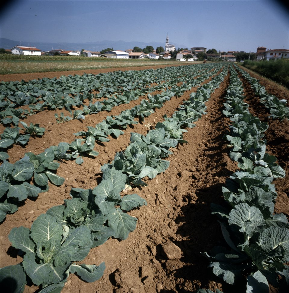 Campo di cavoli e sullo sfondo la chiesa di Sant'Andrea |
