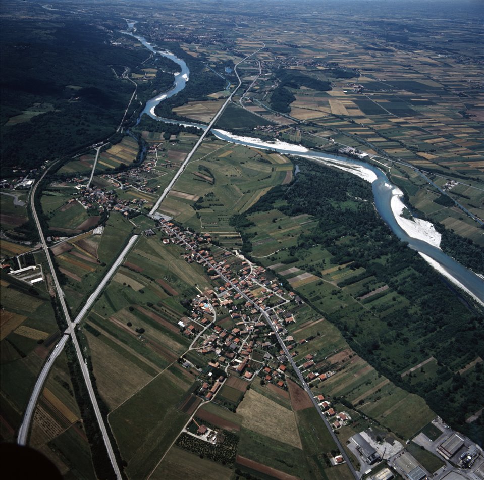 Veduta aerea dell’abitato di Savogna d'Isonzo con il fiume Isonzo, l’autostrada A34 Villesse-Gorizia e linea ferroviaria Udine-Trieste; sulla sinistra il Carso |