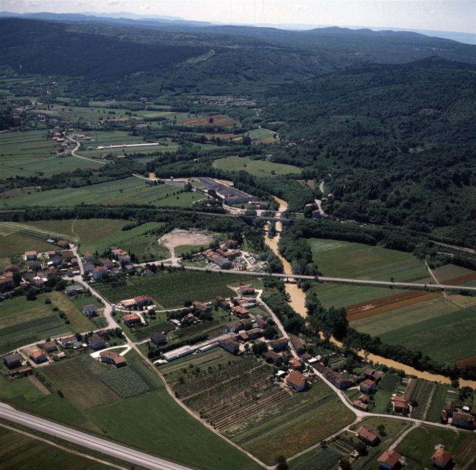 Veduta aerea di parte dell’abitato di Savogna d'Isonzo con il fiume Vipacco, un tratto della linea ferroviaria Udine-Trieste e il Carso |