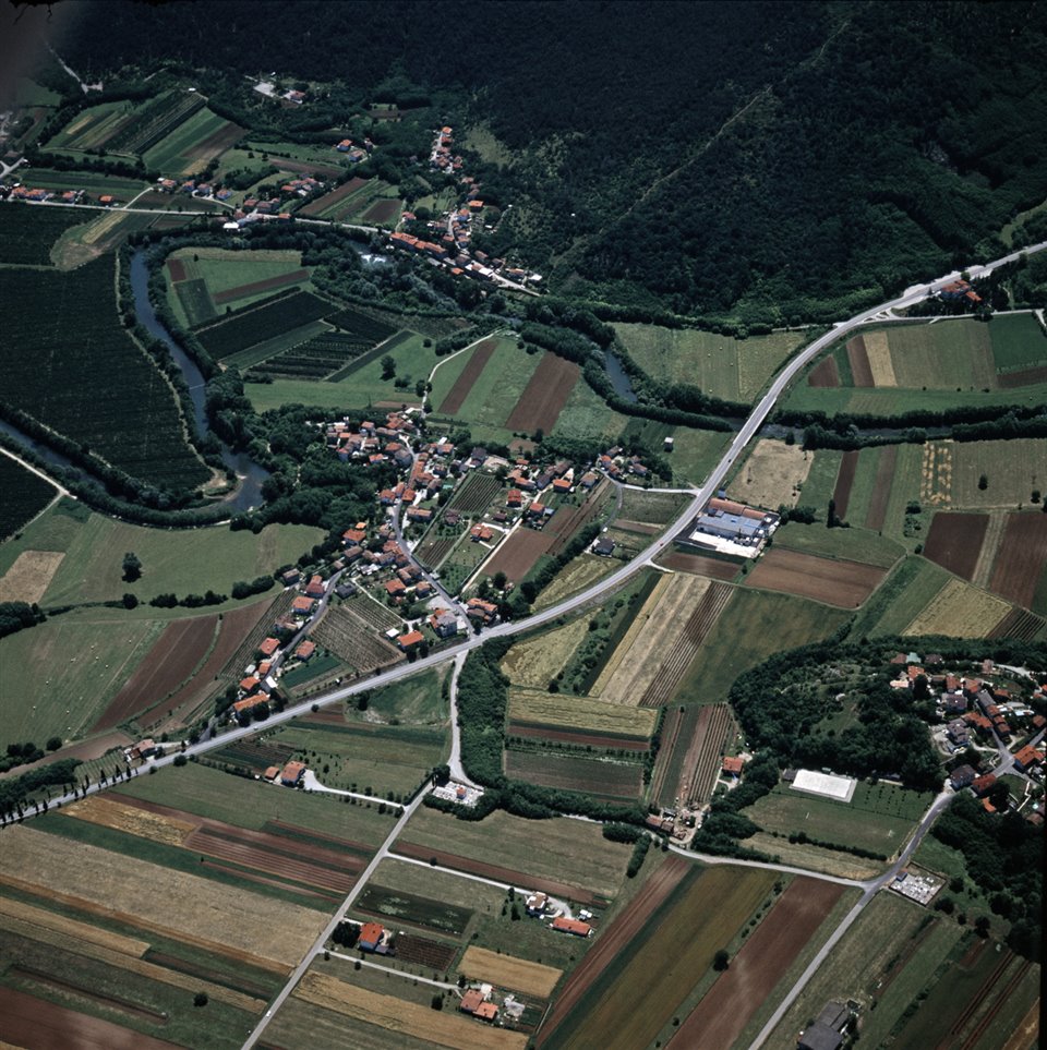Veduta aerea delle frazioni di Rupa e Peci con il fiume Vipacco e un tratto della strada statale 55 |
