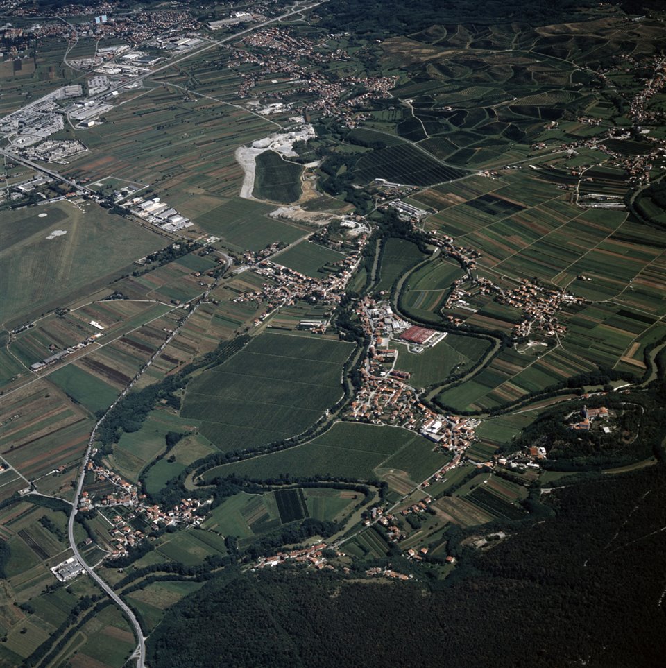 Veduta aerea della frazione di Rupa nel comune di Savogna d'Isonzo e il fiume Vipacco. Sulla destra l’abitato di Merna in Slovenia |