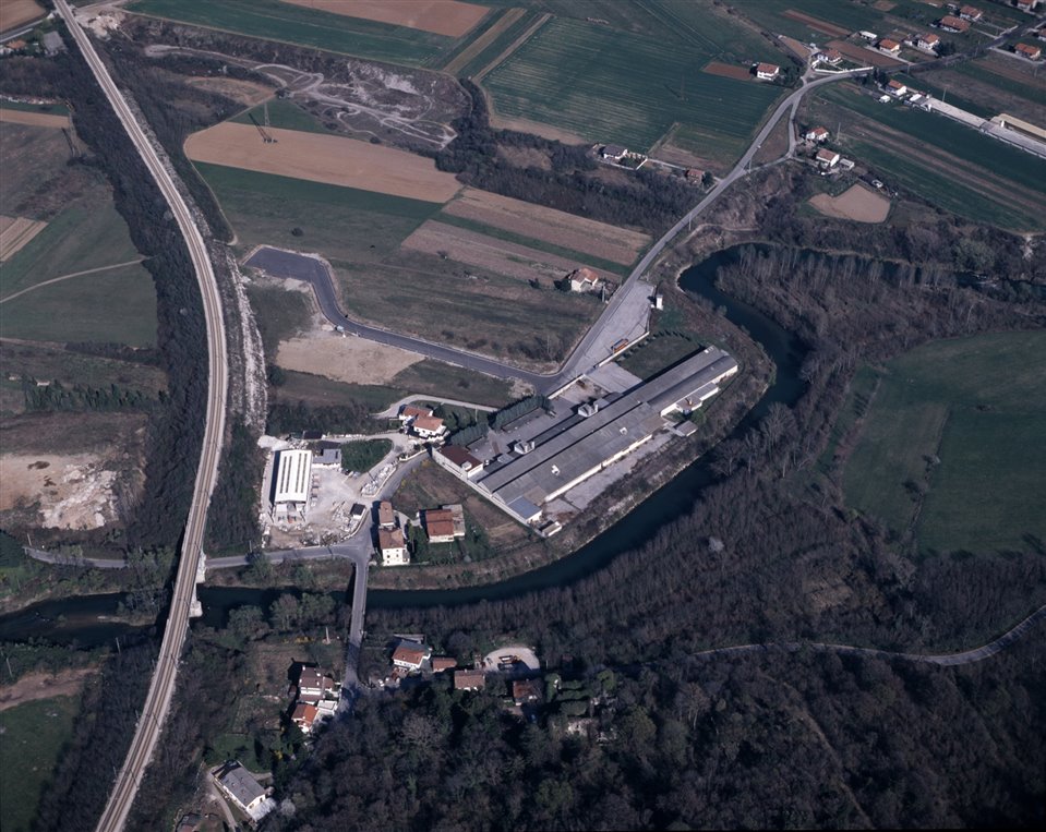 Veduta aerea della frazione di Rubbia nel comune di Savogna d’Isonzo e di un tratto della linea ferroviaria Udine-Trieste e del fiume Vipacco |