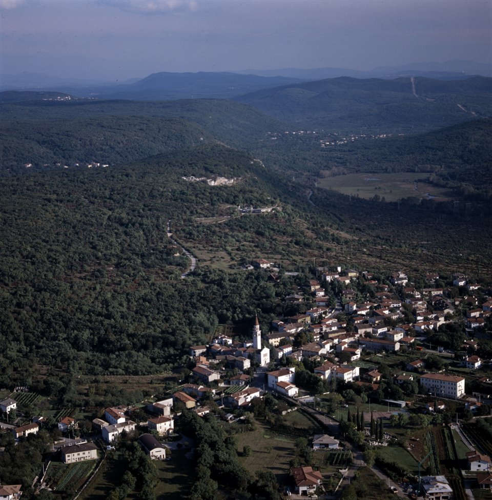 Veduta aerea dell’abitato di Doberdò del Lago con il Carso; in fondo a destra il lago di Doberdò |