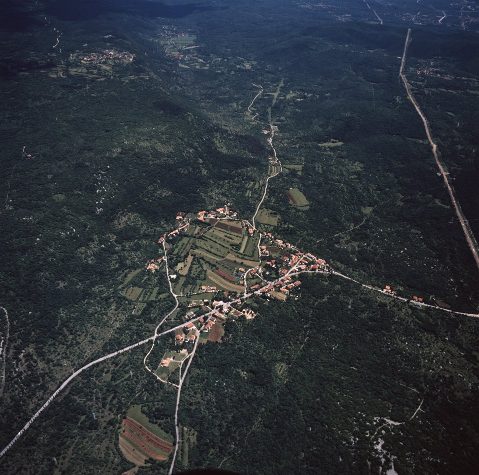 Veduta aerea della frazione di Iamiano nel comune di Doberdò del Lago con il Carso e un tratto della strada statale 55 |