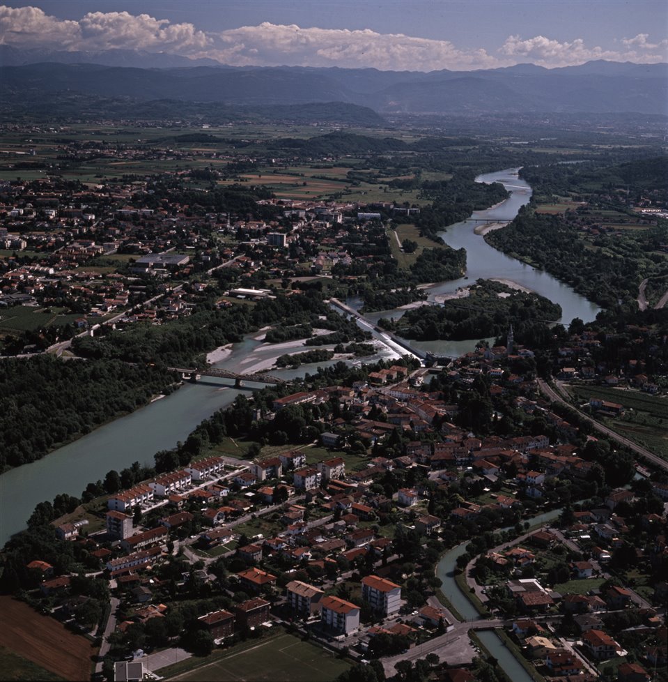 Veduta aerea del fiume Isonzo con l’abitato di Sagrado, la Rosta (o Presa sull’Isonzo), un tratto della linea ferroviaria Udine-Trieste, il ponte della strada regionale 305 e in primo piano un tratto del Canale De Dottori. Sulla sinistra l’abitato di Gradisca d’Isonzo e sullo sfondo il Monte Calvario e l’altopiano di Tarnova |