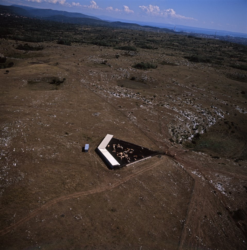 Veduta aerea delle alture di Polazzo; sullo sfondo il Carso e la città di Monfalcone |