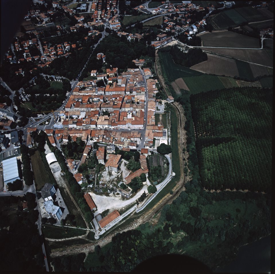 Veduta aerea di Gradisca d'Isonzo con il Castello di Gradisca d’Isonzo; in primo piano il centro storico |