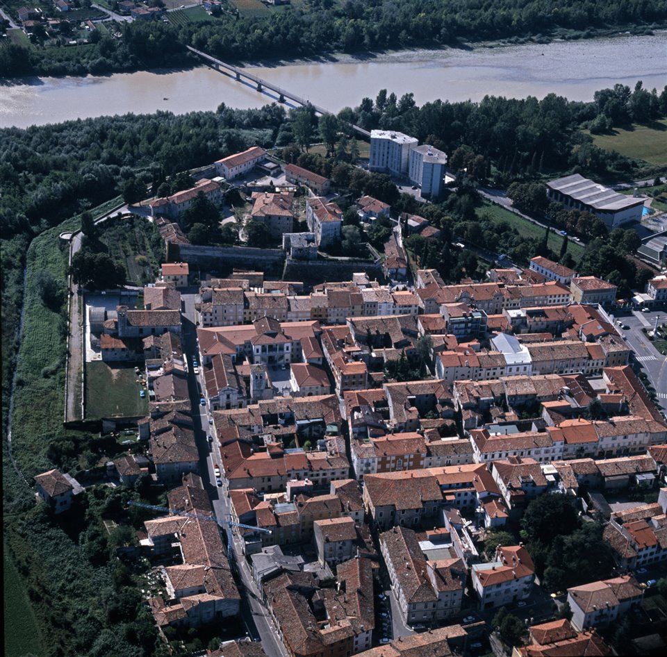 | Soggetto | Veduta aerea del centro storico di Gradisca d'Isonzo con via Cesare Battisti, la chiesa della Beata Vergine Addolorata, Palazzo Torriani (Comune), il Castello di Gradisca, piazzale Unità D’Italia, la palestra comunale; in fondo via Isonzo, la passerella di Poggio Terza Armata e il fiume Isonzo |