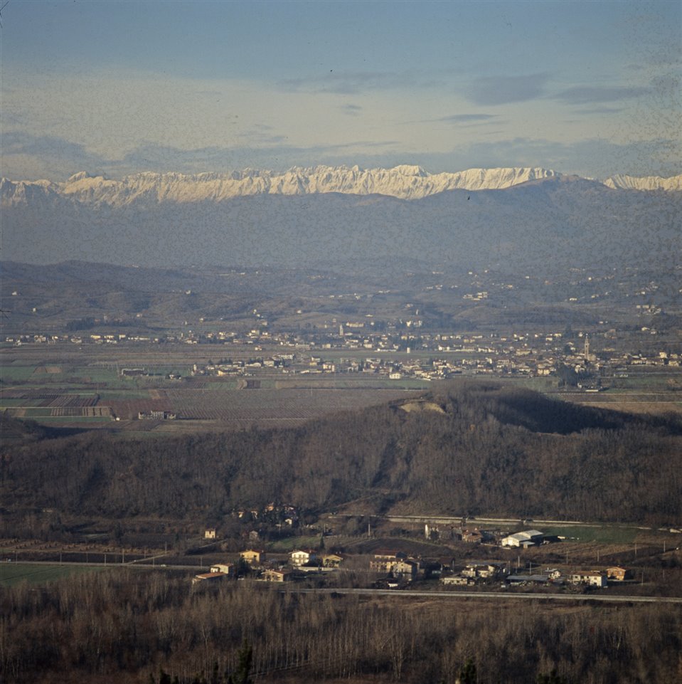 Veduta aerea del Monte Fortin, sullo sfondo l’abitato di San Lorenzo Isontino e le Prealpi Giulie |