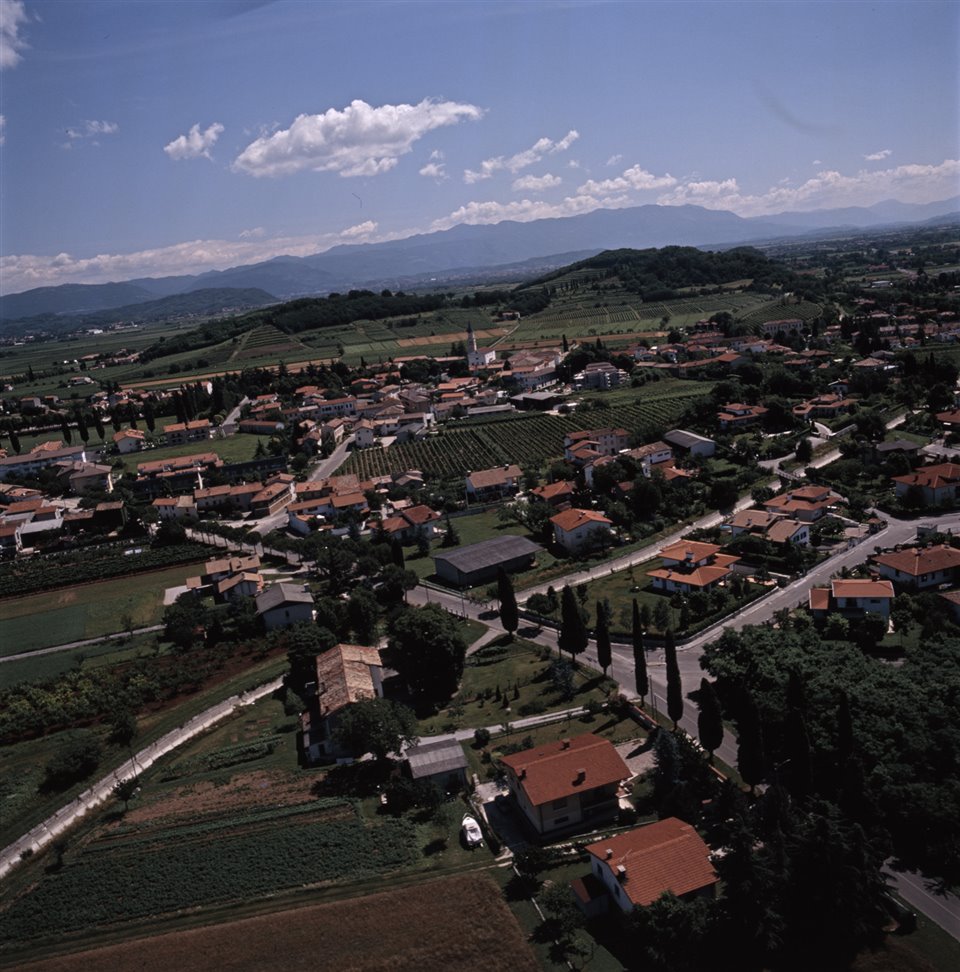 Veduta aerea dell’abitato di Farra d'Isonzo con in primo piano via San Pelagio e la strada della Locatella. Al centro via Roma, la chiesa di Santa Maria Assunta e il Monte Fortin; sullo sfondo l’altopiano di Tarnova |