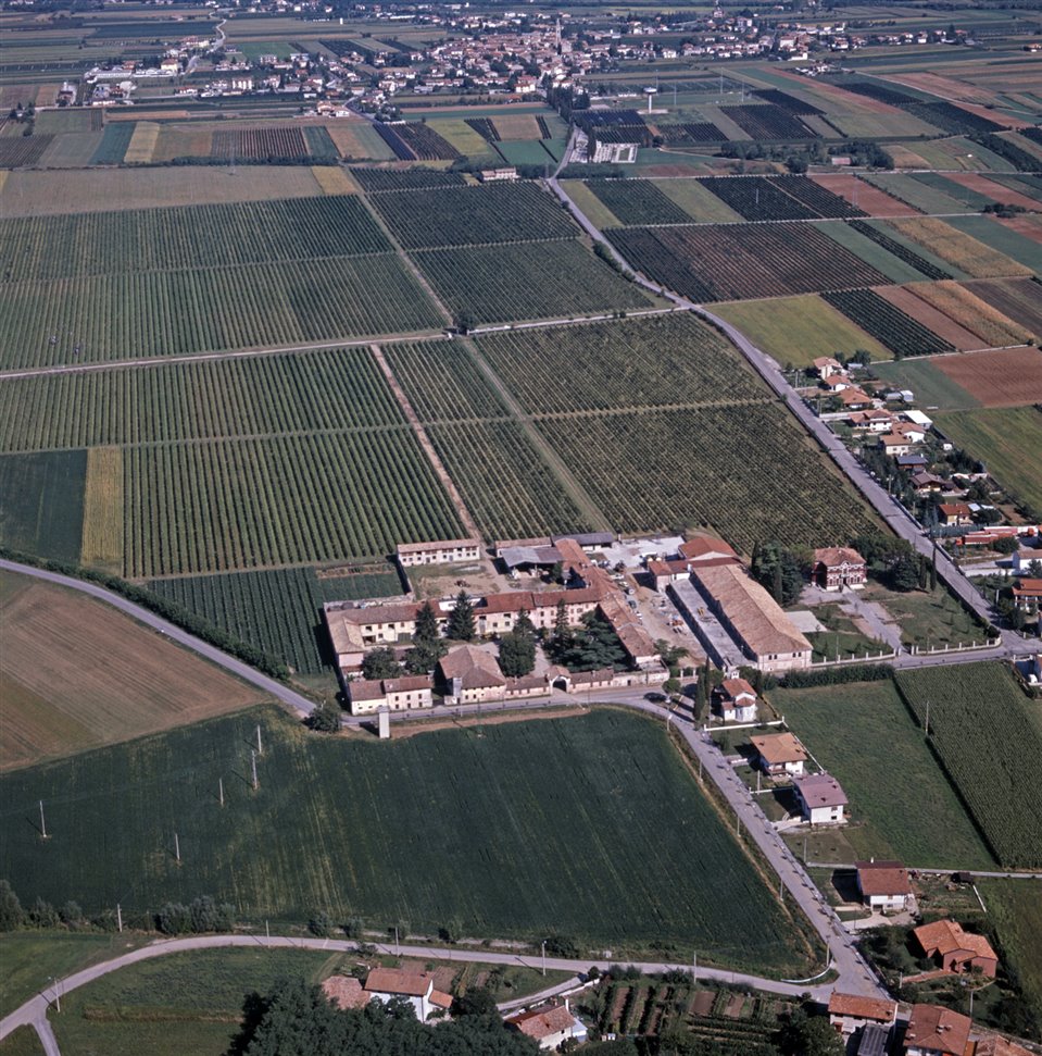 Veduta aerea della frazione di Villanova di Farra nel comune di Farra d'Isonzo con via Contessa Beretta, la Tenuta Villanova e in fondo l’abitato di San Lorenzo Isontino |