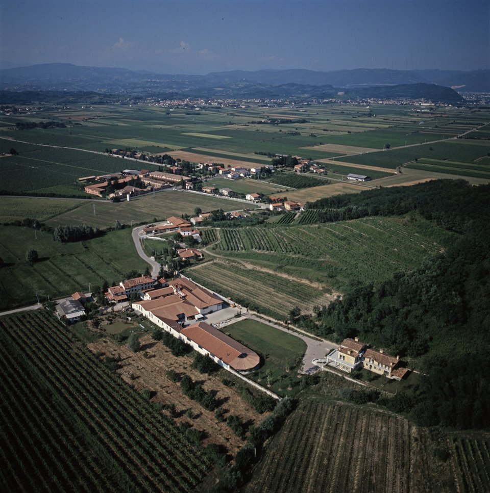 Veduta aerea della frazione di Villanova di Farra nel comune di Farra d'Isonzo con in primo piano l’azienda agricola Jermann; sullo sfondo le Prealpi giulie |