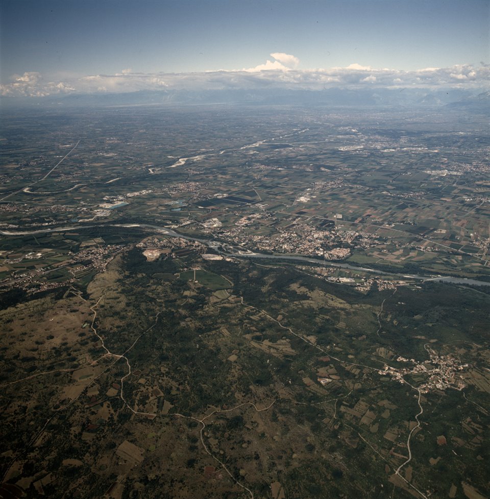 Veduta aerea della pianura friulana con in primo piano il Carso, a sinistra la frazione di Polazzo nel comune di Fogliano-Redipuglia e a destra la frazione di San Martino del Carso nel comune di Doberdò del Lago. Al centro il fiume Isonzo con gli abitati di Sagrado e Gradisca d’Isonzo; in fondo le Prealpi Carniche |