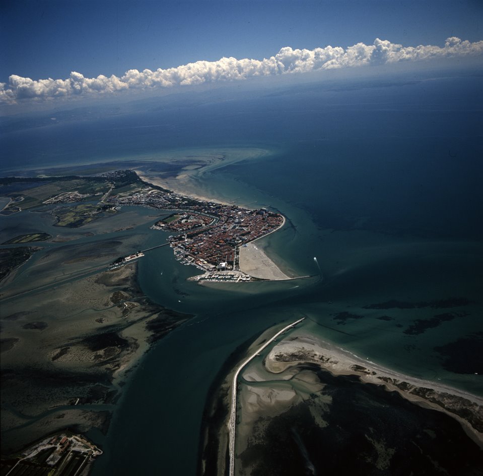Veduta aerea della città di Grado con la laguna di Grado. Sulla sinistra un tratto della strada regionale 352, al centro Porto San Vito e in primo piano un tratto del Banco d’Orio |