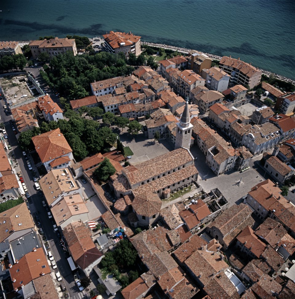 Veduta aerea di parte della città di Grado con la basilica di Santa Eufemia e sulla sinistra via Marina |