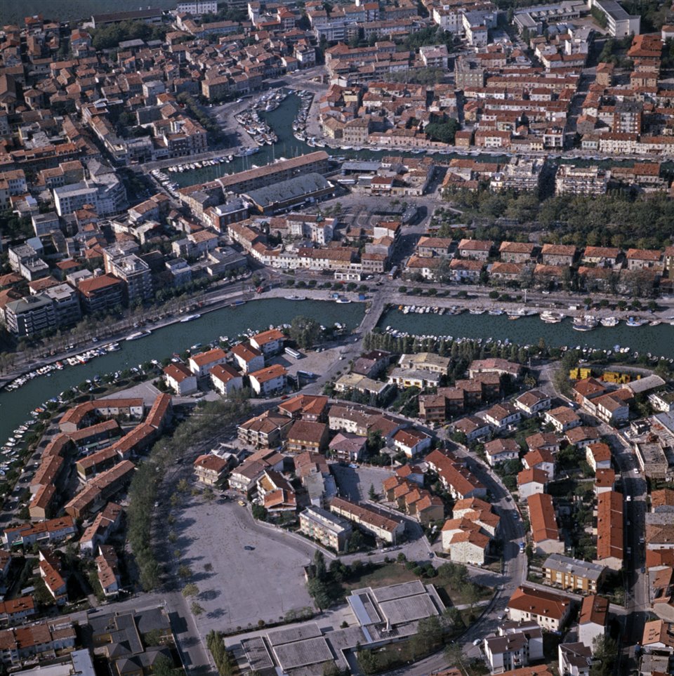 Veduta aerea del canale della Schiusa con in primo piano parte dell’isola della Schiusa, al centro il ponte di via Alessandro Volta, il Porto Vecchio e il canale del porto |