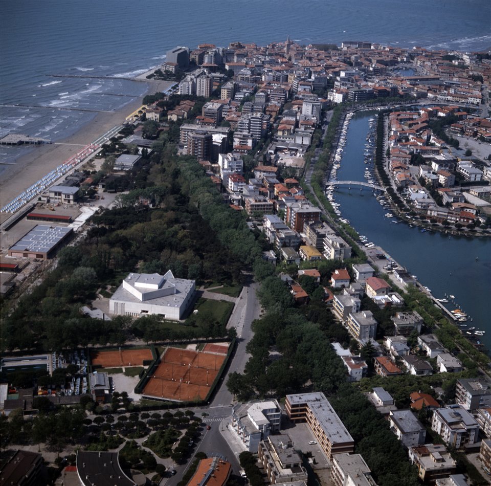 Veduta aerea della città di Grado con in primo piano il Parco delle Rose e l’Auditorium “Biagio Marin”; sulla sinistra la spiaggia nuova e sulla destra il canale della Schiusa, il ponte pedonale della Schiusa e un tratto dell’isola della Schiusa |