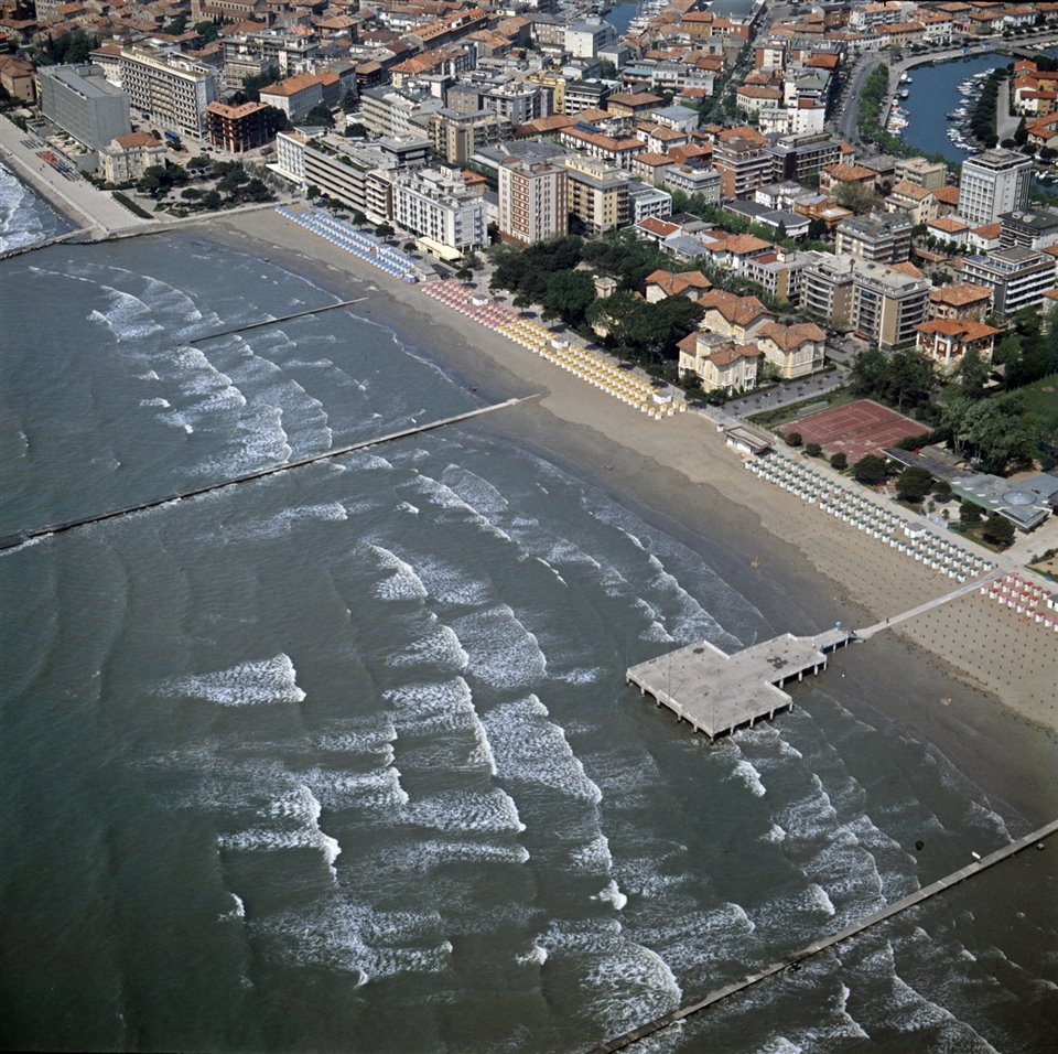 Veduta aerea di parte della città di Grado con un tratto della spiaggia nuova |