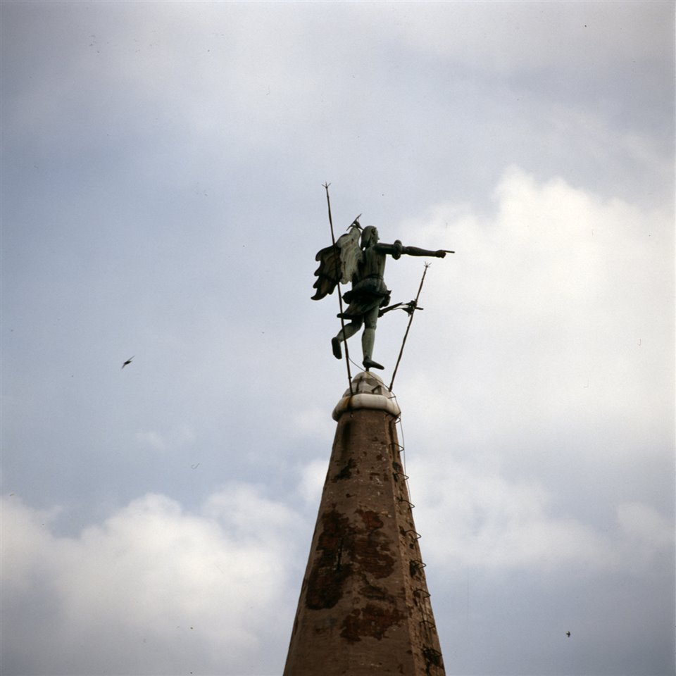 Statua di San Michele Arcangelo sulla cima del campanile della basilica di Santa Eufemia |