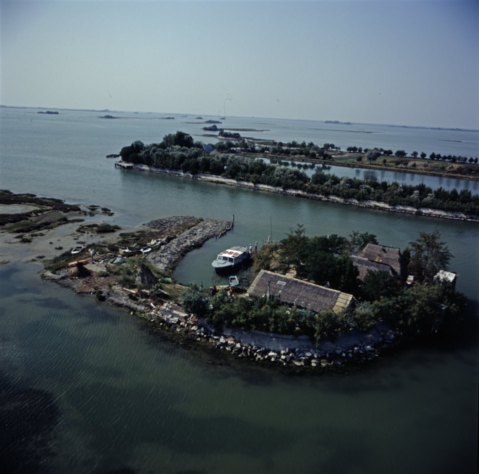 Veduta aerea di un casone nella laguna di Grado di ponente |