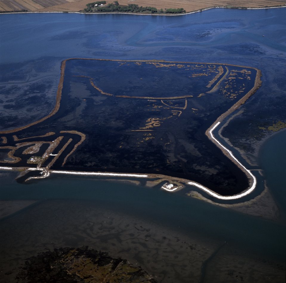 Veduta aerea della laguna di Grado di ponente con l’isola di Ara Storta |