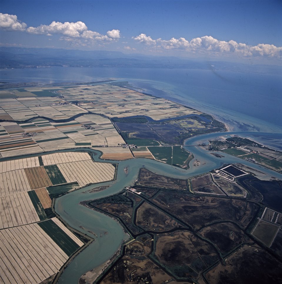 Veduta aerea della laguna di Grado di levante; in basso il canale Primero e parte dell’isola Panera; in alto il territorio di Fossalon nel comune di Grado e il canale di Aversa; sullo sfondo il golfo di Panzano |