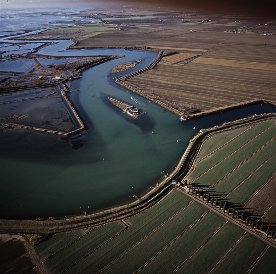 Veduta aerea della laguna di Grado di levante con il canale Primero e parte dell’isola Panera; in fondo parte dell’isola del Lovo e il canale Cavegi |