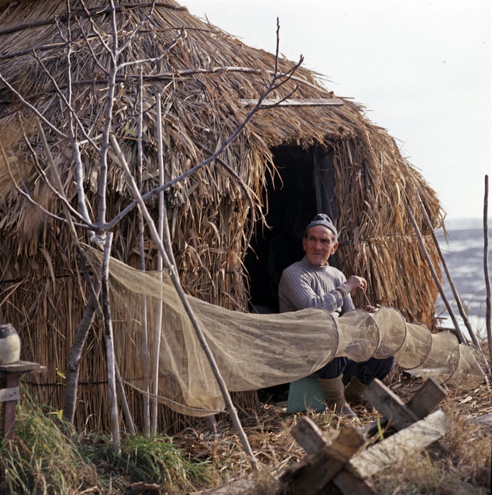 Un pescatore rammenda le reti davanti a un casone nella laguna di Grado |