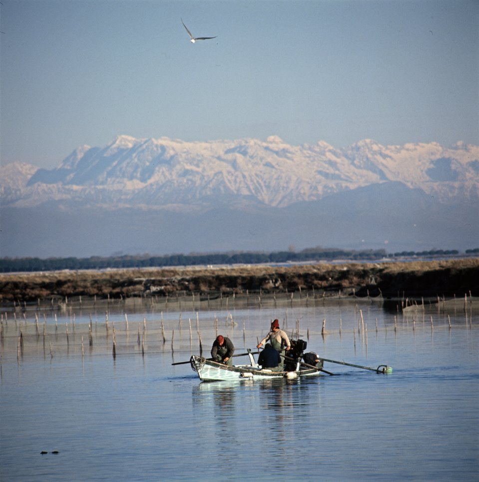 Pescatori nella laguna di Grado; sullo sfondo le Prealpi Giulie |