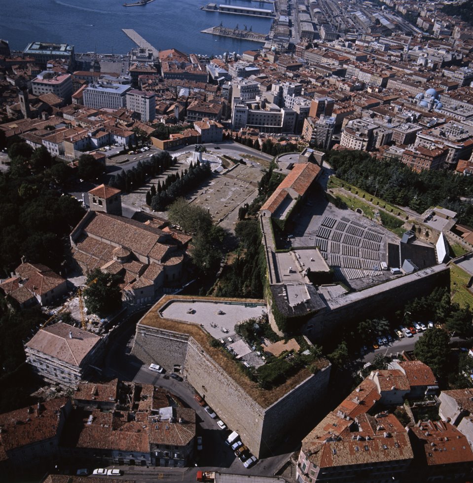 Veduta aerea del centro storico con un tratto di via San Giusto, la cattedrale di San Giusto Martire e il Castello di San Giusto. In fondo piazza Unità d’Italia e il Molo Audace |