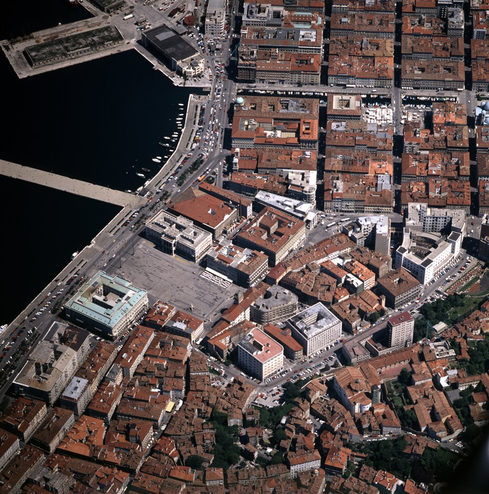 Veduta aerea di piazza Unità d’Italia con il Palazzo del Municipio, Palazzo Stratti e il Palazzo della Luogotenenza austriaca (Prefettura), Palazzo Pitteri, il Grand Hotel Duchi d'Aosta e il Palazzo della compagnia di navigazione Lloyd Austriaco di Navigazione, poi Lloyd Triestino (Regione); sulla sinistra la Riva del Mandracchio e il Molo Audace, in basso a destra la chiesa di Santa Maria Maggiore e via del Teatro Romano