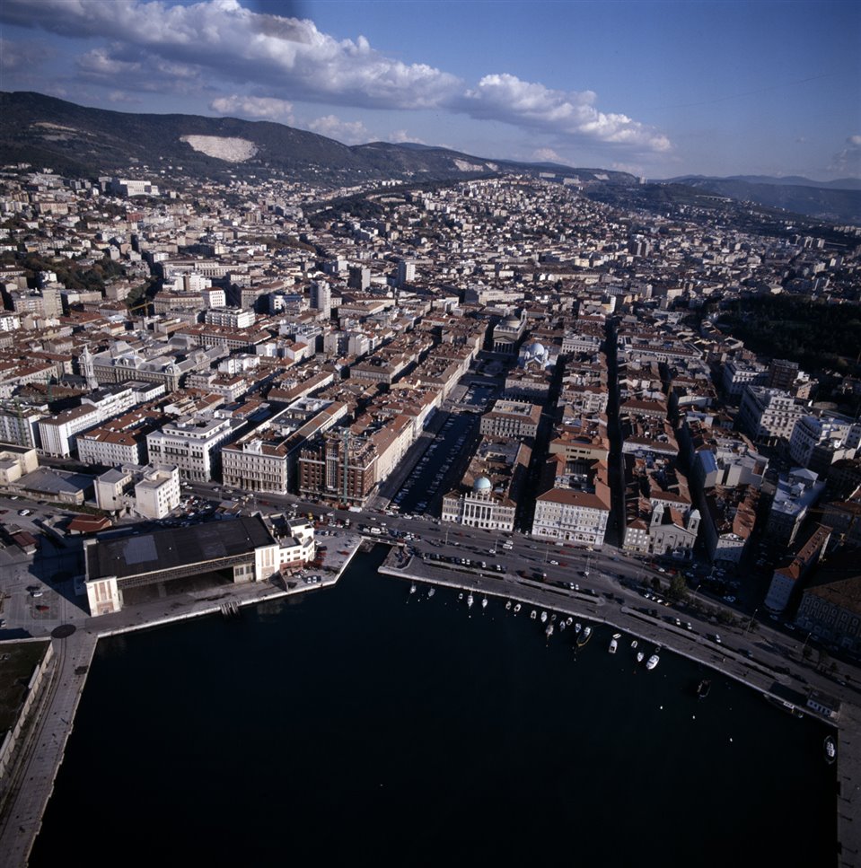 Veduta aerea del Borgo Teresiano con in primo piano la Capitaneria di Porto, Riva Tre Novembre con a sinistra la chiesa greco-ortodossa. Al centro il canale Ponte Rosso con in fondo la chiesa di Sant’Antonio Taumaturgo e sullo sfondo il Carso |