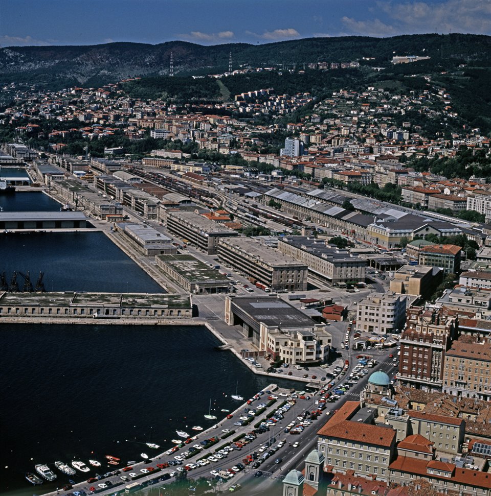 Veduta aerea di parte del Porto Vecchio con in primo piano Riva Tre Novembre e la Capitaneria di Porto. Sulla destra la stazione di Trieste Centrale e sullo sfondo il Carso |
