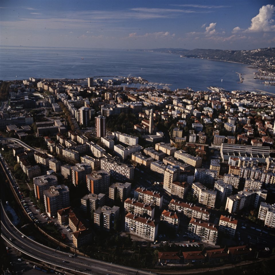 Veduta aerea del quartiere Sant’Andrea con la chiesa Madonna del Mare, in fondo il golfo di Trieste e il Carso |
