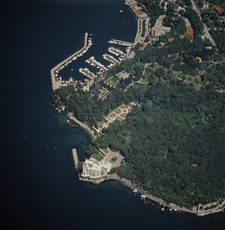 Veduta aerea del Castello di Miramare con il parco del Castello di Miramare e il porto di Grignano |