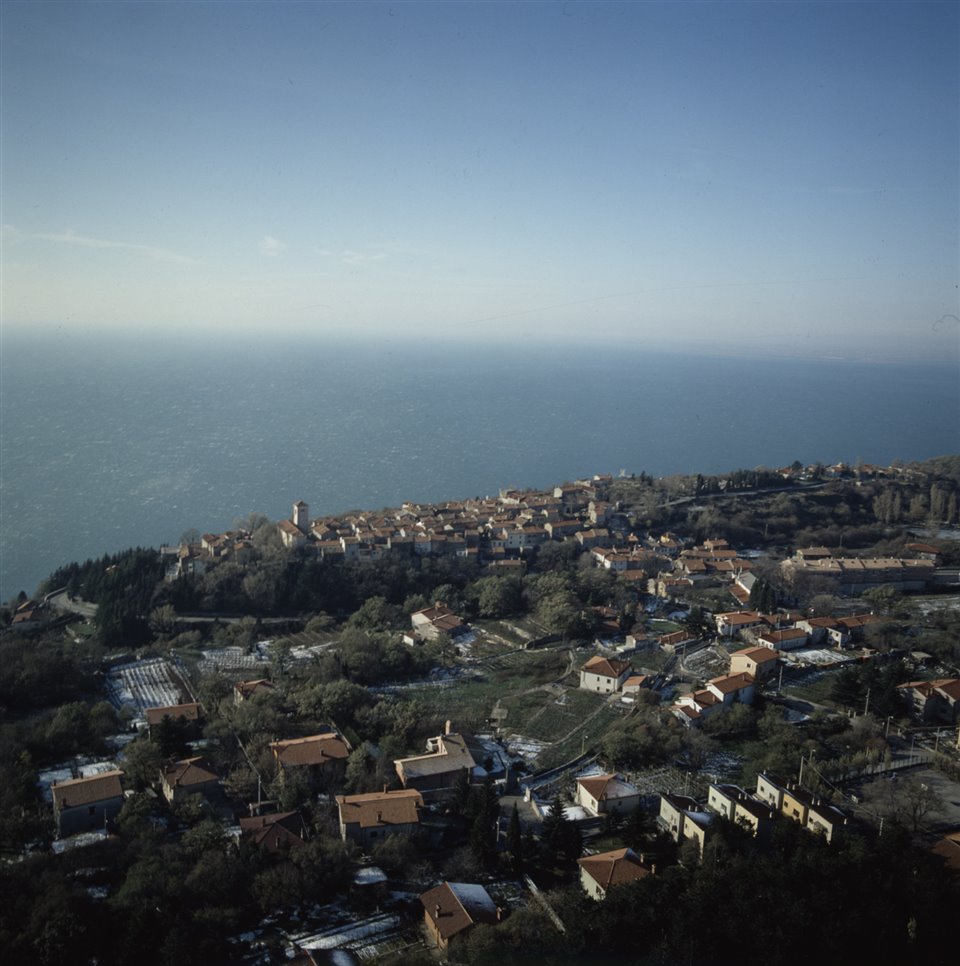 Veduta aerea della frazione di Contovello nel comune di Trieste con la chiesa di San Gerolamo e sullo sfondo il golfo di Trieste |