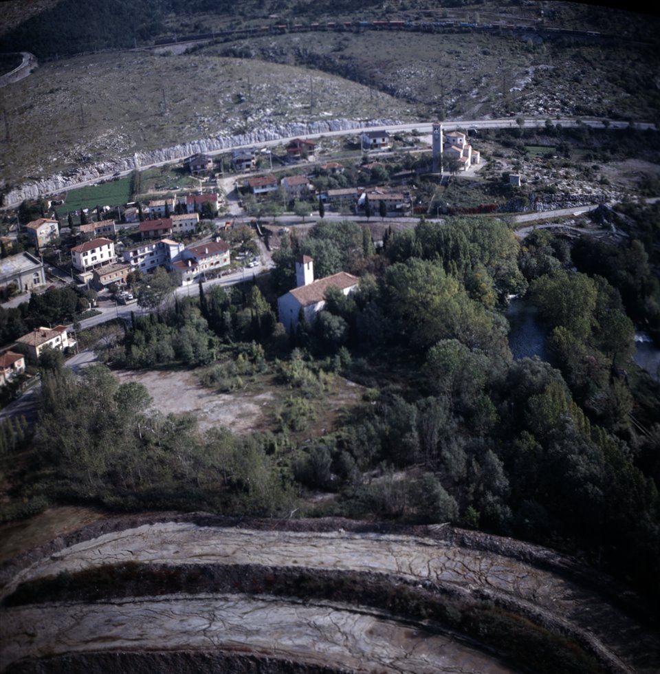 Veduta aerea della frazione di San Giovanni di Duino nel comune di Duino-Aurisina con la strada statale 14, in primo piano la chiesa di San Giovanni in Tuba e sullo sfondo la chiesa di San Giovanni Battista e l’autostrada A4 Venezia-Trieste |