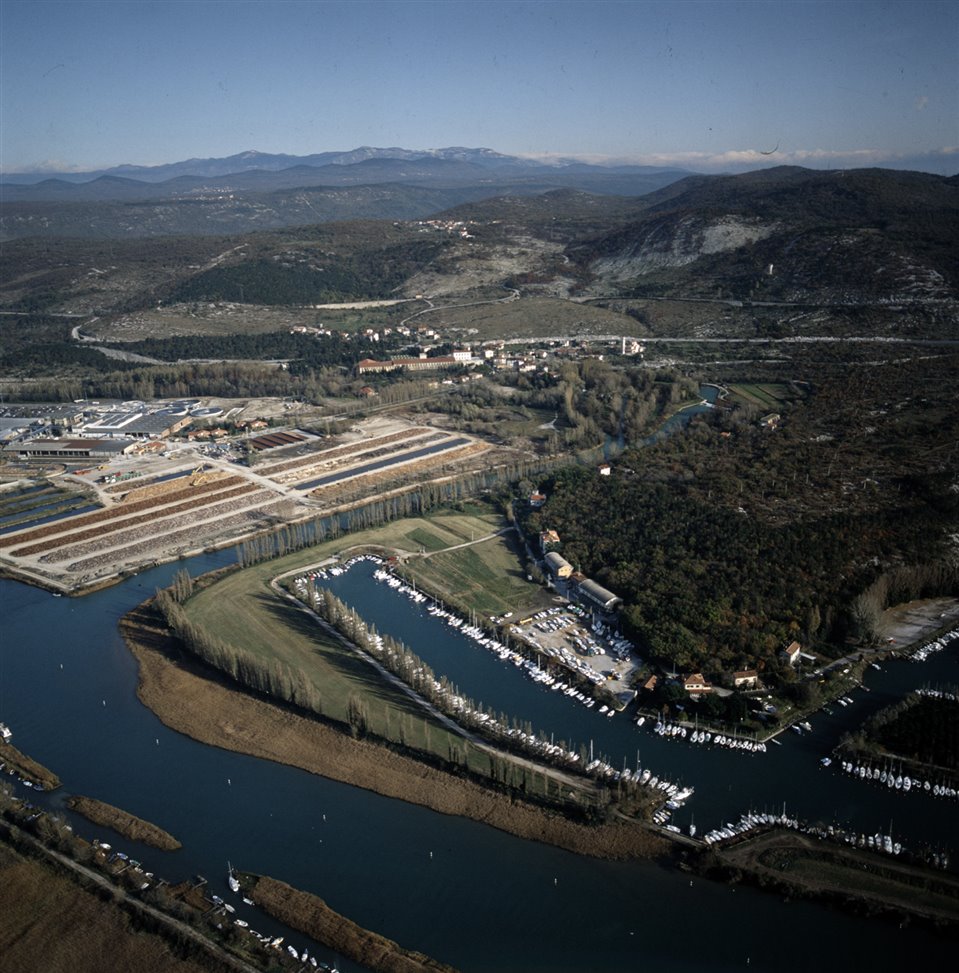 Veduta aerea del fiume Timavo in prossimità della frazione di San Giovanni di Duino nel comune di Duino-Aurisina e a sinistra la cartiera Burgo; a destra il Villaggio del Pescatore, sul fondo il Carso e il Monte Hermada |