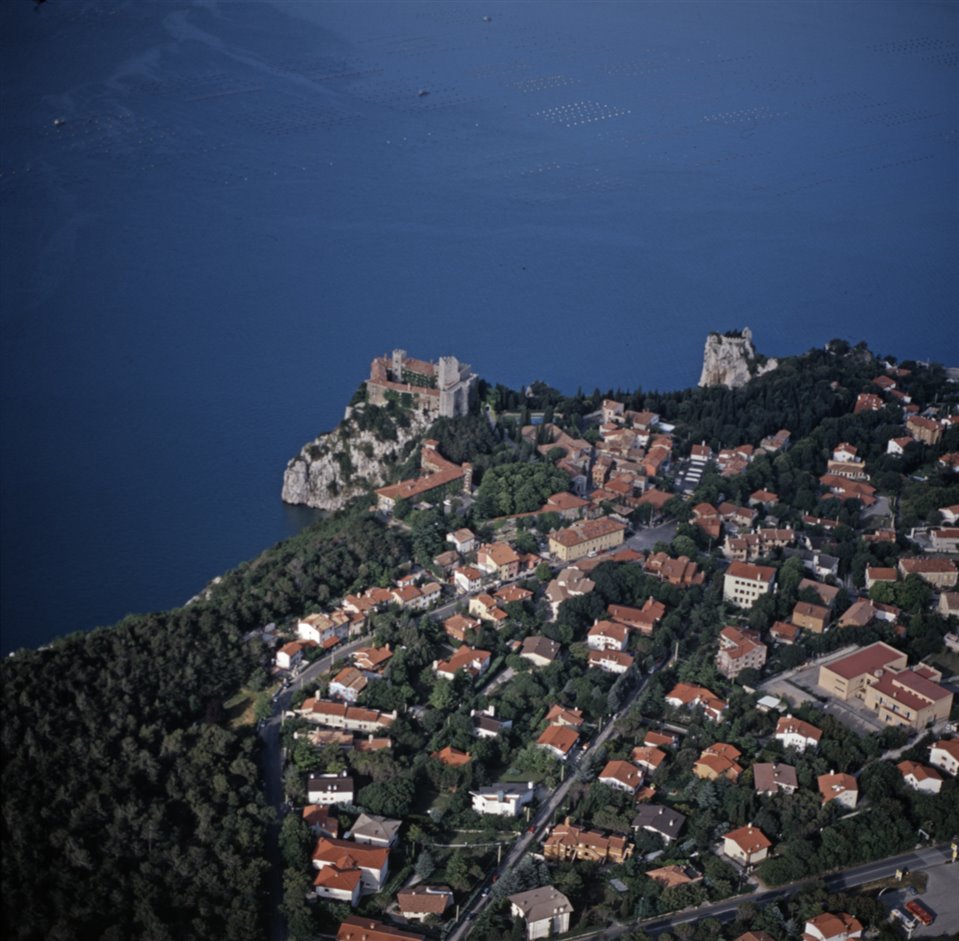 Veduta aerea dell’abitato di Duino-Aurisina con i Castelli di Duino sul golfo di Trieste |