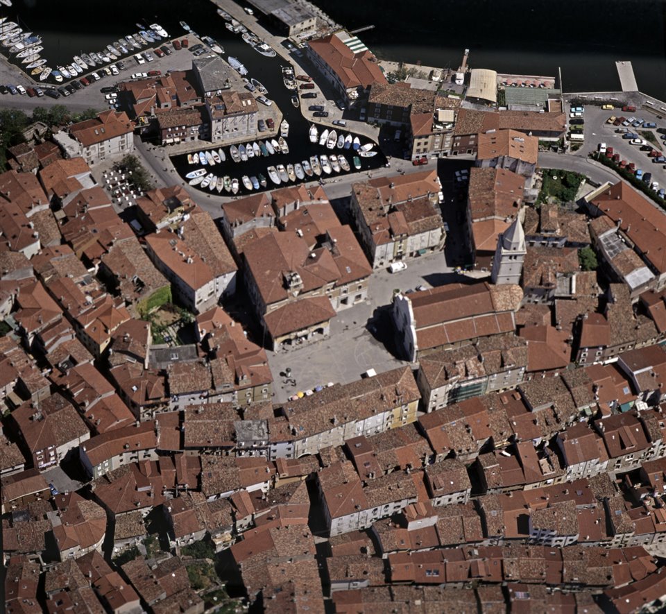 Veduta aerea di Muggia con Riva De Amicis, la chiesa dei Santi Giovanni e Paolo (Duomo) e piazza Guglielmo Marconi |