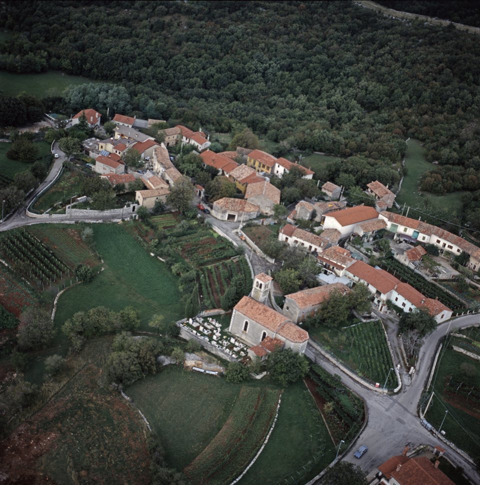 Veduta aerea della frazione di San Pelagio nel comune di Duino-Aurisina con la chiesa di San Pelagio |